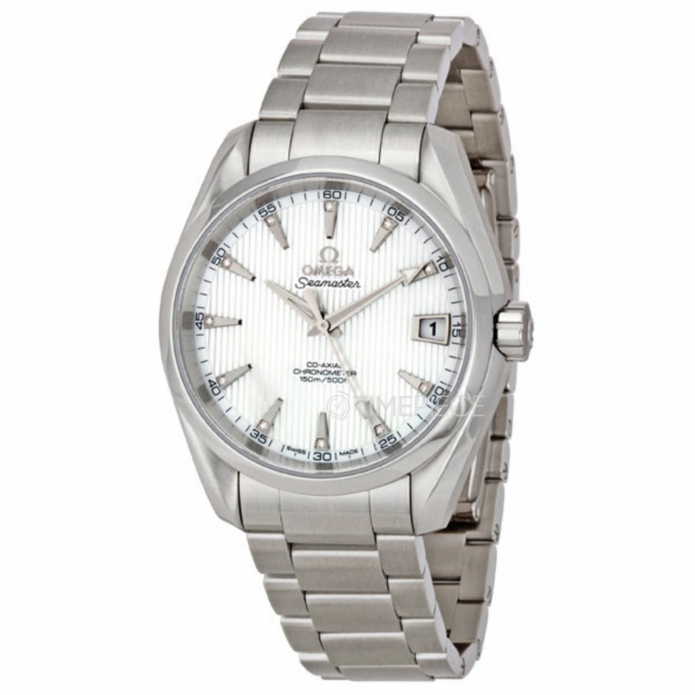 Stainless steel case with a stainless steel bracelet. Fixed stainless steel bezel. Mother of pearl dial with silver-tone hands and stick and diamond hour markers. Minute markers around the outer rim. Dial Type: Analog. Date displays at the 3 o'clock position. Automatic movement with a 60 hour power reserve. Scratch resistant sapphire crystal. Textured steel crown. Skeleton case back. Case diameter: 38.5 mm. Round case shape. Deployment clasp. Water resistant at 150 meters / 500 feet. Functions: date, hour, minute, second. Dress watch style. Watch label: Swiss Made. Omega Seamaster Aqua Terra 150 M Co-Axial 38.5 mm Mens Watch 231.10.39.21.55.001.