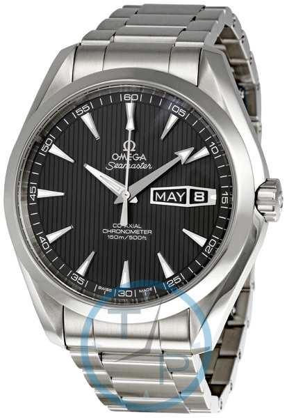 Stainless steel case with a stainless steel bracelet. Fixed stainless steel bezel. Tech grey dial with luminous hands and index hour markers. Minute markers around the outer rim. Dial Type: Analog. Luminescent hands and markers. Day of the week and date display at the 3 o'clock position. Automatic chronometer movement. Scratch resistant sapphire crystal. Screw down crown. Skeleton case back. Case diameter: 43 mm. Case thickness: 14.5 mm. Round case shape. Band width: 21 mm. Push button fold over clasp. Water resistant at 150 meters/ 500 feet. Functions: hours, minutes, seconds, calendar. Luxury watch style. Watch label: Swiss Made. Omega Seamaster Aqua Terra Annual Calendar Mens Watch 23110432206001.