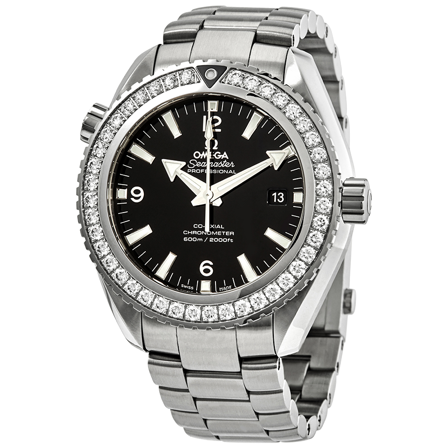 Stainless steel case with a stainless steel bracelet. Uni-directional rotating stainless steel bezel set with diamonds. Black dial with luminous silver-tone hands and index hour markers. Arabic numerals mark the 6, 9 and 12 o'clock positions. Minute markers around the outer rim. Dial Type: Analog. Luminescent hands and markers. Date display at the 3 o'clock position. Omega calibre 8500 automatic movement with a 60-hour power reserve. Scratch resistant sapphire crystal. Screw down crown. Transparent case back. Round case shape. Case size: 45.5 mm. Case thickness: 15.2 mm. Band width: 22 mm. Deployment clasp. Water resistant at 600 meters / 2000 feet. Functions: date, hour, minute, second, co-axial escapement, chronometer. Dive watch style. Watch label: Swiss Made. Omega Seamaster Planet Ocean Automatic Mens Diamond Watch 232.15.46.21.01.001.