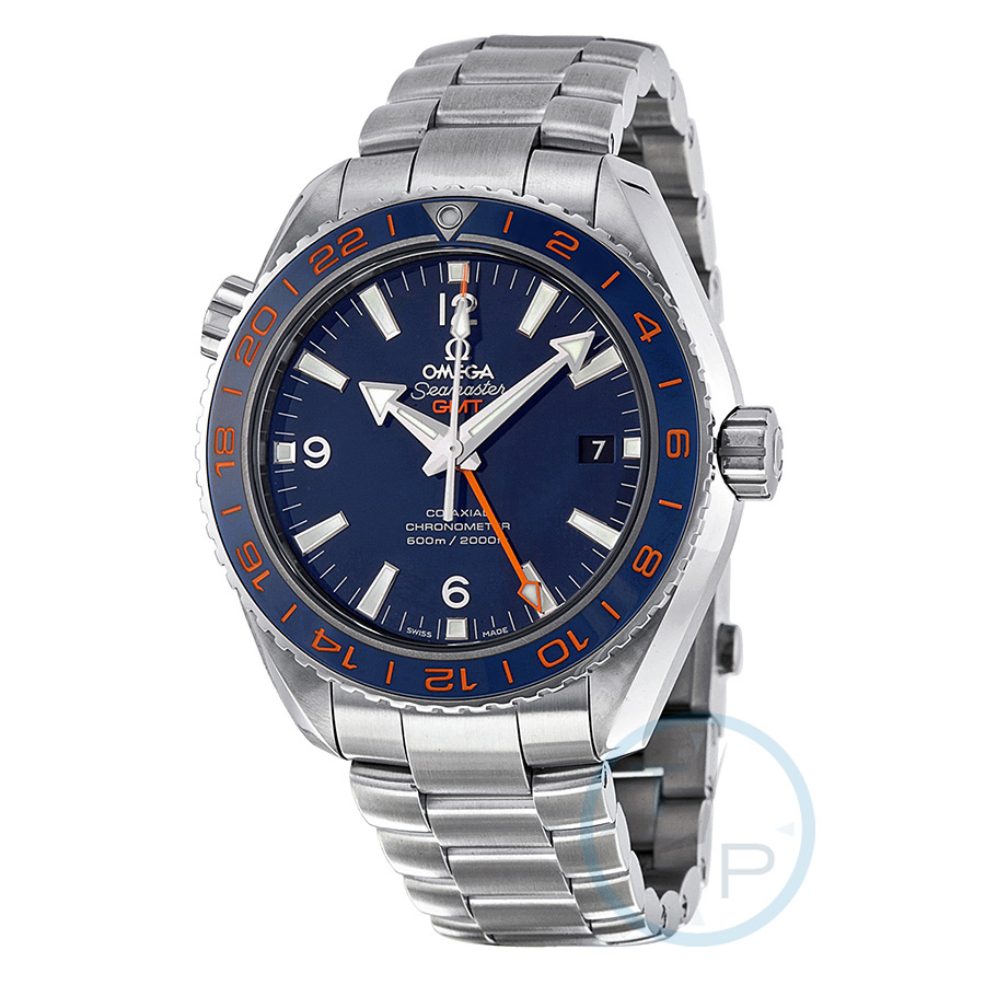 Stainless steel case with a stainless steel bracelet. Uni-directional rotating stainless steel bezel with a blue ceramic ring. Blue dial with luminous silver-tone hands and index hour markers. Arabic numerals mark the 6, 9 and 12 o'clock position. Minute markers around the outer rim. Dial Type: Analog. Luminescent hands and markers. Date display at the 3 o'clock position. Omega calibre 8605 automatic movement with a 60-hour power reserve. Scratch resistant sapphire crystal. Screw down crown. Skeleton case back. Round case shape. Case size: 43.5 mm. Case thickness: 17.25 mm. Band width: 21 mm. Deployment clasp. Water resistant at 600 meters / 2000 feet. Functions: GMT, second time zone, date, hour, minute, second, chronometer. Additional Info: helium escapement valve at the 10 o'clock position. Luxury watch style. Watch label: Swiss Made. Item Variations: 232 30 44 22 03 001, 232-30-44-22-03-001, 232/30/44/22/03/001, 23230442203001. Omega Planet Ocean Blue Dial Mens Watch 232.30.44.22.03.001.