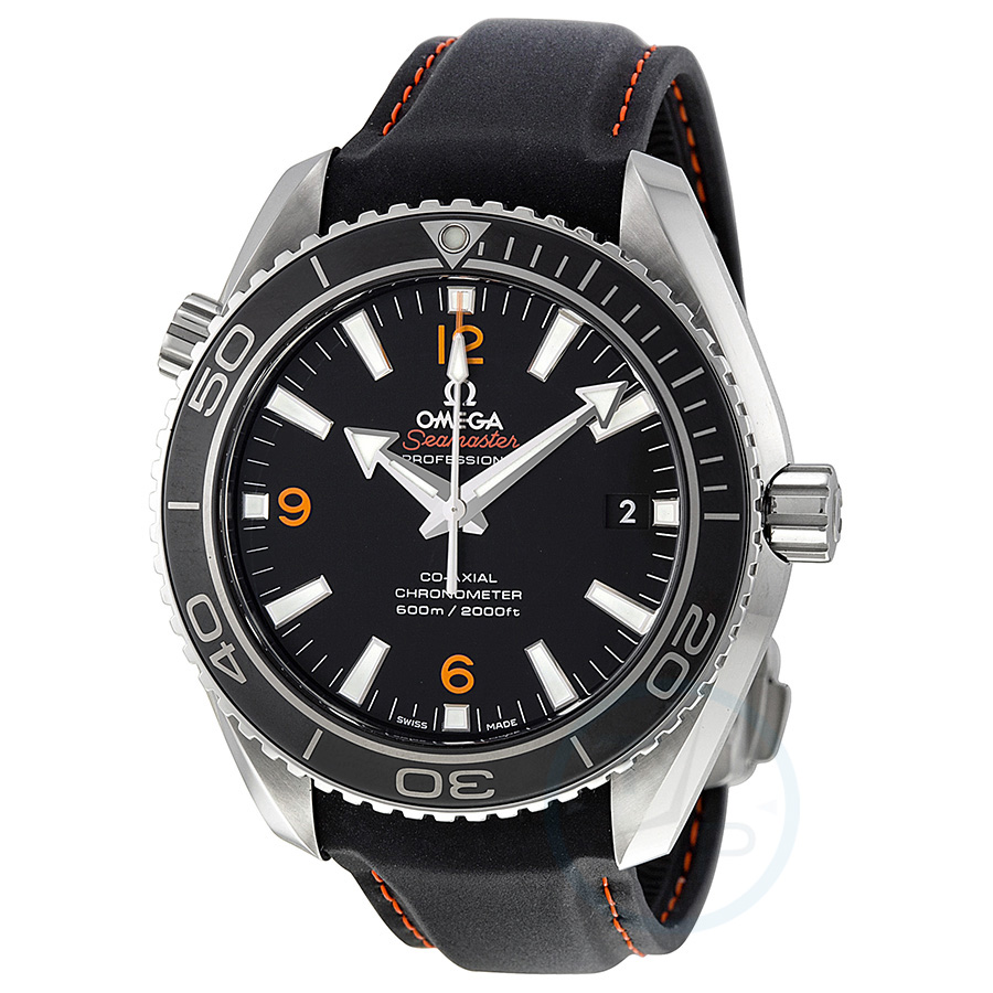 Stainless steel case with a black rubber strap. Uni-directional rotating stainless steel bezel with a black ceramic insert. Black dial with luminous silver-tone hands and index hour markers. Arabic numerals mark the 6, 9 and 12 o'clock positions. Minute markers around the outer rim. Dial Type: Analog. Luminescent hands and markers. Date display at the 3 o'clock position. Omega calibre 8500 automatic movement with a 60-hour power reserve. Scratch resistant sapphire crystal. Screw down crown. Skeleton case back. Case size: 42 mm. Case thickness: 16.3 mm. Round case shape. Band width: 20 mm. Deployment clasp with a push button release Water resistant at 600 meters / 2000 feet. Functions: date, hour, minute, second, chronometer. Casual watch style. Watch label: Swiss Made. Item Variations: 232 32 42 21 01 005, 232-32-42-21-01-005, 232/32/42/21/01/005, 23232422101005. Omega Seamaster Planet Ocean Automatic Black Dial Mens Watch 232.32.42.21.01.005.