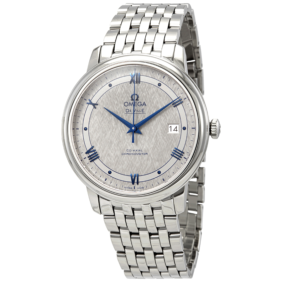 Stainless steel case with a stainless steel bracelet. Fixed stainless steel bezel. Grey dial with blued dauphine-style hands and alternating Roman numeral and dot cabochon hour markers. Minute markers around the outer rim. Dial Type: Analog. Date display at the 3 o'clock position. Omega calibre 2500 automatic movement, based upon ETA 2892-A2, containing 27 Jewels, bitting at 25200 vph, and has a power reserve of approximately 48 hours. Scratch resistant sapphire crystal. Pull / push crown. Solid case back. Round case shape. Case size: 39.5 mm. Band width: 20 mm. Hidden fold over clasp. Water resistant at 30 meters / 100 feet. Functions: date, hour, minute, second, co-axial escapement, chronometer. De Ville Prestige Series. Luxury watch style. Watch label: Swiss Made. Omega De Ville Prestige Chronograph Automatic Grey Dial Mens Watch 424.10.40.20.06.002.