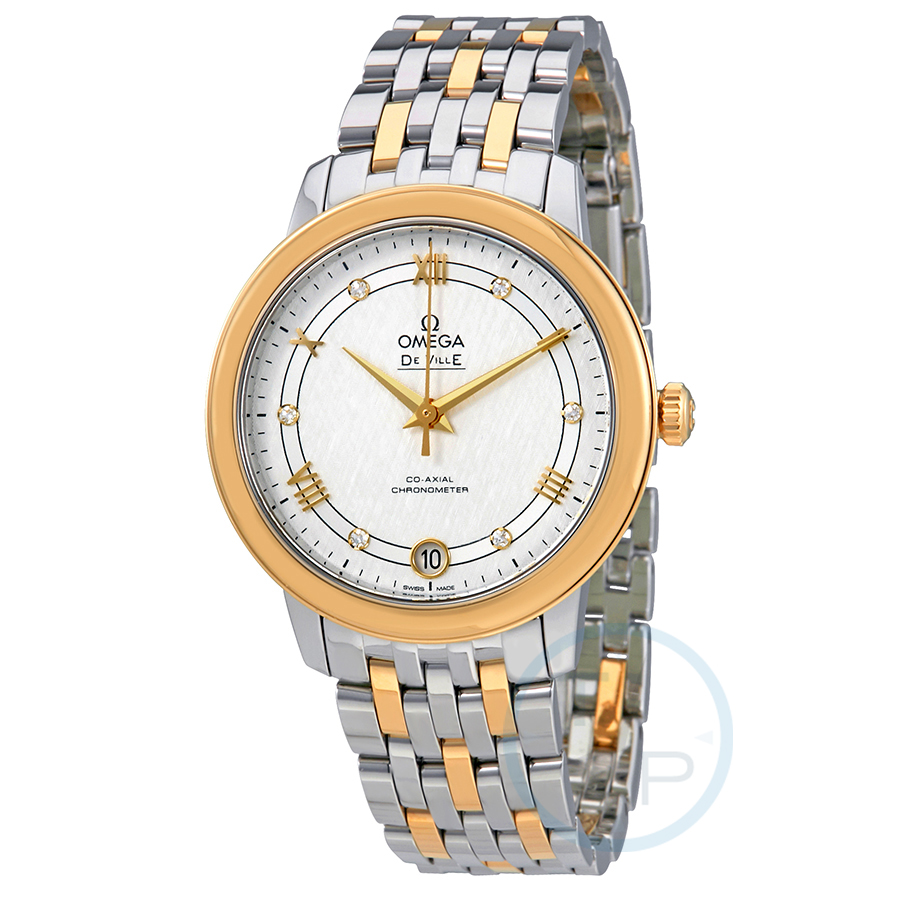 Silver-tone stainless steel case with a two-tone (silver-tone and gold-tone) stainless steel and 18kt yellow gold bracelet. Fixed 18kt yellow gold bezel. Silver and grey silk pattern dial with rose gold-tone dauphine-style shape hands and alternating Roman numeral and diamond hour markers. Minute markers around the outer rim. Dial Type: Analog. Date display at the 6 o'clock position. Omega Calibre 2500 Automatic movement, based upon ETA 2892-A2, containing 27 Jewels, bitting at 25200 vph, and has a power reserve of approximately 48 hours. Scratch resistant sapphire crystal. Pull / push crown. Solid case back. Round case shape. Case size: 32.7 mm. Band width: 16 mm. Deployment clasp. Water resistant at 30 meters / 100 feet. Functions: date, hour, minute, second, co-axial escapement, chronometer. Luxury watch style. Watch label: Swiss Made. Omega De Ville Prestige Co-Axial Silver Diamond Dial Ladies Watch 424.20.33.20.52.001.