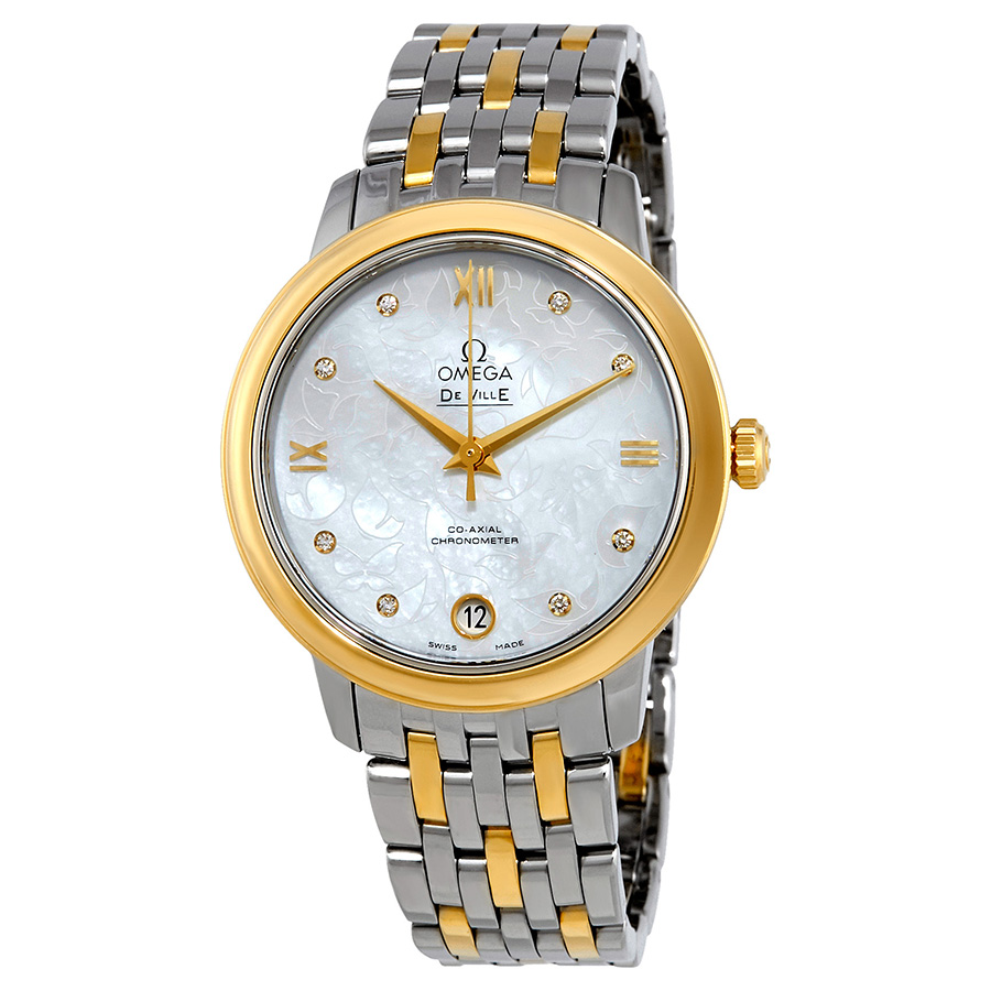 The beautiful Omega 424.20.33.20.55.002 watch features a stainless steel 32.7mm case, with a fixed bezel, and a white mother of pearl dial covered by a scratch resistant sapphire crystal. The stylish wristwatch is equipped with an exclusive 16mm stainless steel and 18kt yellow gold which combines comfort and sturdiness. This horological trendy device has date, hour, minute, second, chronometer functions.