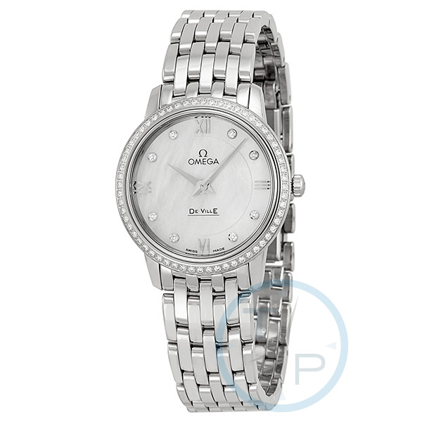 Stainless steel case with a stainless steel bracelet. Fixed stainless steel bezel set with diamonds. Mother of pearl dial with silver-tone hands and diamond hour markers. Roman numerals mark the 3, 6, 9 and 12 o'clock positions. Dial Type: Analog. Omega calibre 1376 quartz movement with a 48 months power reserve. Scratch resistant sapphire crystal. Pull / push crown. Solid case back. Round case shape. Case size: 27.4 mm, case thickness: 8 mm. Band width: 17 mm. Band length: 6 inches. Fold over clasp with a push button release. Water resistant at 30 meters / 100 feet. Functions: hour, minute. Luxury watch style. Watch label: Swiss Made. Omega DeVille Prestige Mother of Pearl Diamond Ladies Watch 42415276055001.