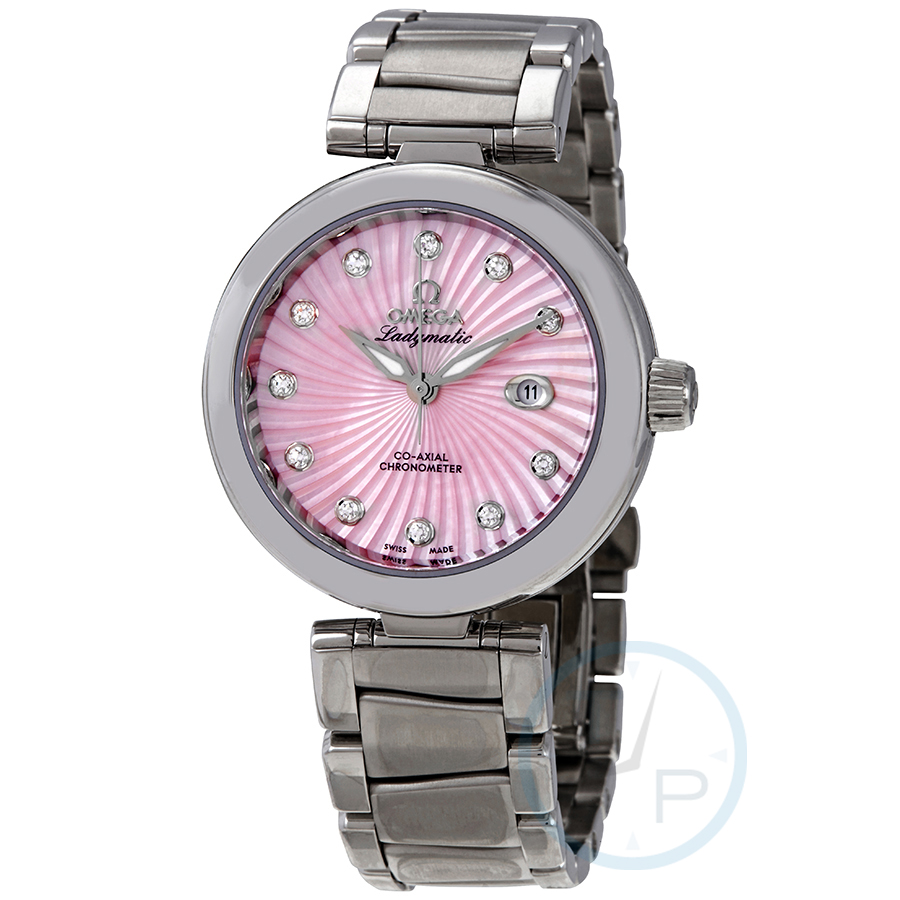 Stainless steel case with a stainless steel bracelet. Fixed bezel. Pink mother of pearl dial with silver-tone hands and diamond index hour markers. Dial Type: Analog. Date display at the 3 o'clock position. Omega Calibre 8520 automatic movement with a 50-hour power reserve. Scratch resistant sapphire crystal. Screw down crown. Transparent case back. Round case shape. Case size: 34 mm. Deployment clasp. Water resistant at 100 meters / 330 feet. Functions: date, hour, minute, second, chronometer. Luxury watch style. Watch label: Swiss Made. Item Variations: 42530342057001. Omega DeVille Pink Mother of Pearl Diamond Dial Automatic Ladies Watch 425.30.34.20.57.001.