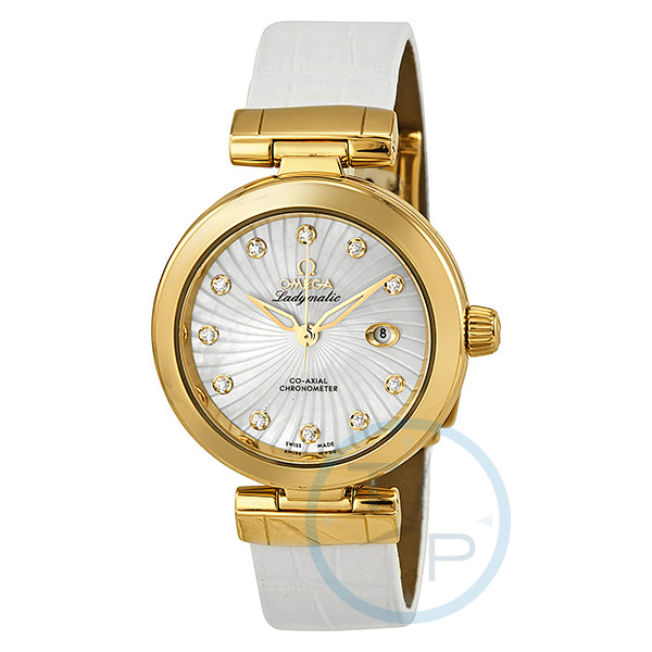 18kt yellow gold case with a white alligator leather strap. Fixed 18kt yellow gold bezel. Mother of pearl dial with gold-tone alpha-style shape hands and diamond hour markers. Dial Type: Analog. Luminescent hands. Date display at the 3 o'clock position. Omega Calibre 8521 Automatic movement, based upon Omega 8520, containing 28 Jewels, bitting at 25200 vph, and has a power reserve of approximately 50 hours. Scratch resistant sapphire crystal. Screw down crown. Skeleton case back. Round case shape, case size: 34 mm, case thickness: 12.3 mm. Band width: 20 mm, band length: 7 inches. Deployment with push button release clasp. Water resistant at 100 meters / 330 feet. Functions: date, hour, minute, second, chronometer. Luxury watch style. Watch label: Swiss Made. Omega De Ville Ladymatic Diamond Yellow Gold Ladies Watch 42563342055002.