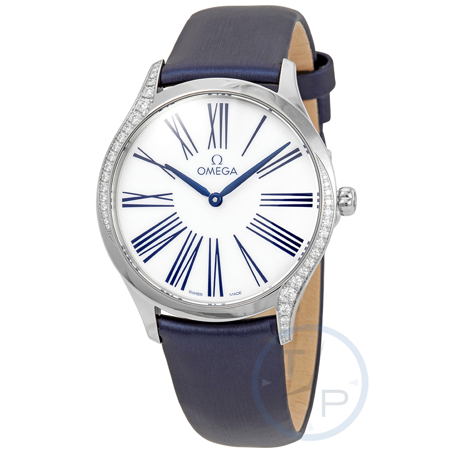 Stainless steel case with a blue fabric (leather backed) strap. Fixed stainless steel bezel set with diamonds. White dial with blue hands and Roman numeral hour markers. Dial Type: Analog. Omega calibre 4061 quartz movement. Scratch resistant sapphire crystal. Pull / push crown. Solid case back. Round case shape. Case size: 36 mm. Case thickness: 8.85 mm. Band width: 18 mm. Tang clasp. Water resistant at 30 meters / 100 feet. Functions: hour, minute. Luxury watch style. Watch label: Swiss Made. Omega De Ville Diamond White Dial Ladies Watch 428.17.36.60.04.001