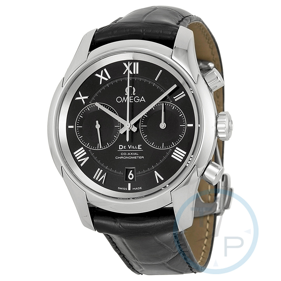 Stainless steel case with a black leather strap. Fixed stainless steel bezel. Black dial with silver-tone hands and Roman numeral hour markers. Minute markers around an inner ring. Dial Type: Analog. Date display at the 6 o'clock position. Chronograph - two sub-dials displaying: 12 hour and 60 seconds. Omega calibre 9300 automatic movement, containing 54 Jewels, composed of 337 parts, bitting at 28800 vph, and has a power reserve of approximately 60 hours. Scratch resistant sapphire crystal. Pull / push crown. Transparent case back. Round case shape. Case size: 42 mm. Case thickness: 16 mm. Band width: 22.9 mm. Fold over clasp with a push button release. Water resistant at 100 meters / 330 feet. Functions: chronograph, date, hour, minute, second, chronometer. De Ville Co-axial Series. Luxury watch style. Watch label: Swiss Made. Item Variations: 431 13 42 51 01 001, 431-13-42-51-01-001, 431/13/42/51/01/001, 43113425101001. Omega De Ville Co-Axial Black Dial Black Leather Mens Watch 431.13.42.51.01.001.