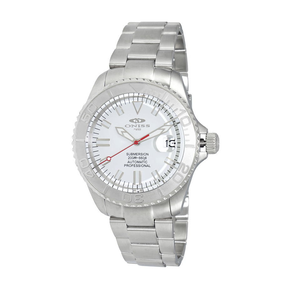 Silver-tone stainless steel case and bracelet. Uni-directional rotating silver-tone stainless steel bezel. White dial with silver-tone sword-shaped hands and index hour markers. Minute scale around the inner rim. Dial Type: Analog. Luminescent hands and markers. Magnified date display at the 3 o'clock position. SII Caliber NH35A Automatic movement, containing 24 Jewels, bitting at 21600 vph, and has a power reserve of approximately 41 hours. Scratch resistant mineral crystal. Screw down crown. Transparent case back. Round case shape, case size: 45 mm, case thickness: 13.62 mm. Band width: 21 mm, band length: 7.25 inches. Fold over clasp with a safety release. Water resistant at 200 meters / 660 feet. Functions: date, hour, minute, second. On05515 Series. Casual watch style. Watch label: Japan Movt. Oniss Automatic White Dial Mens Watch ON5515-33-WT.