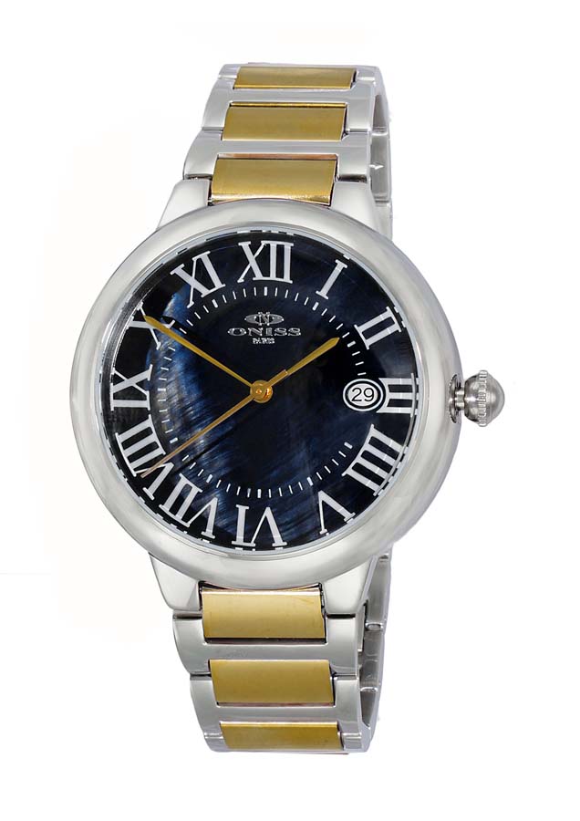 Silver tone stainless steel case with a two tone stainless steel bracelet. Fixed silver tone stainless steel bezel. Black dial with gold-tone hands and Roman numeral hour markers. Minute scale around the inner rim. Dial Type: Analog. Date display at the 3 o'clock position. Automatic movement. Scratch resistant mineral crystal. Push pull crown. Transparent case back. Round case shape. Band width: 20 mm, band length: 6.75 inches. Deployment with push button release clasp. Water resistant at 50 meters / 165 feet. Functions: date, hour, minute, second. Casual watch style. Oniss ON2222 Automatic Black Dial Mens Watch ONJ2222-02TGBK.