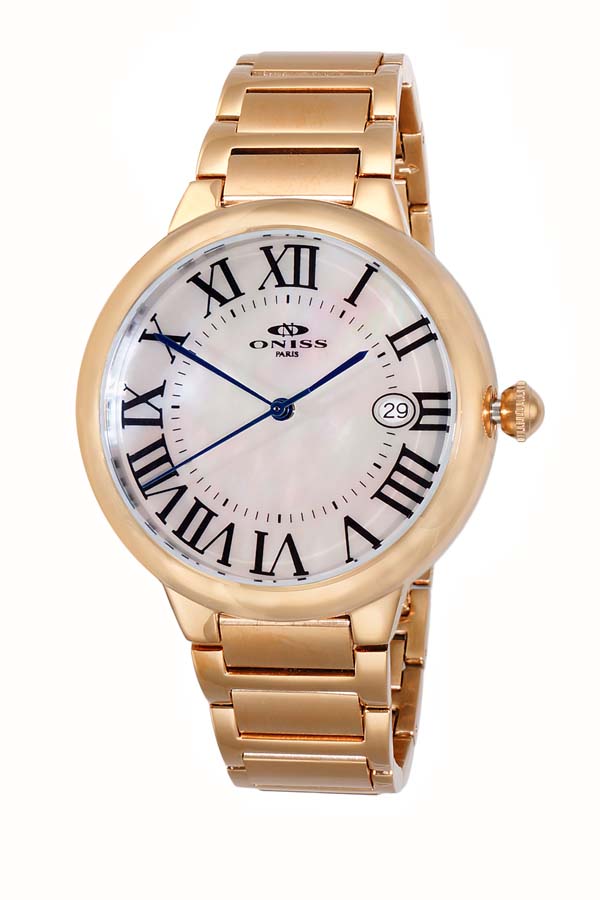 Rose gold tone stainless steel case with a rose gold tone stainless steel bracelet. Fixed rose gold tone stainless steel bezel. White dial with blue hands and Roman numeral hour markers. Minute scale around the inner rim. Dial Type: Analog. Date display at the 3 o'clock position. Automatic movement. Scratch resistant mineral crystal. Push pull crown. Transparent case back. Round case shape. Band width: 20 mm, band length: 6.75 inches. Deployment with push button release clasp. Water resistant at 50 meters / 165 feet. Functions: date, hour, minute, second. Casual watch style. Oniss ON2222 Automatic White Dial Mens Watch ONJ2222-0RGWT.