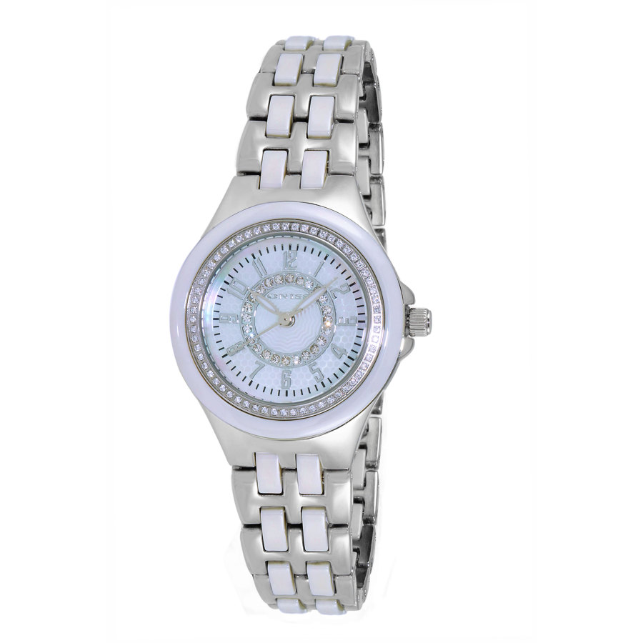 Silver-tone stainless steel case with a two-tone (white and silver-tone) stainless steel and ceramic bracelet. Fixed two-tone (white and silver-tone) crystal set, ceramic and stainless steel bezel. White dial with silver-tone hands and Arabic numeral hour markers. Minute markers around the outer rim. Dial Type: Analog. Luminescent hands. Quartz movement. Scratch resistant mineral crystal. Pull / push crown. Solid case back. Round case shape, case size: 29 mm, case thickness: 9 mm. Band width: 15 mm, band length: 6.25 inches. Deployment with push button release clasp. Water resistant at 50 meters / 165 feet. Functions: hour, minute, second. Dress watch style. Watch label: Japan Movt. Oniss ON2430 WhiteDial Ladies Watch ONJ2430-010WT.