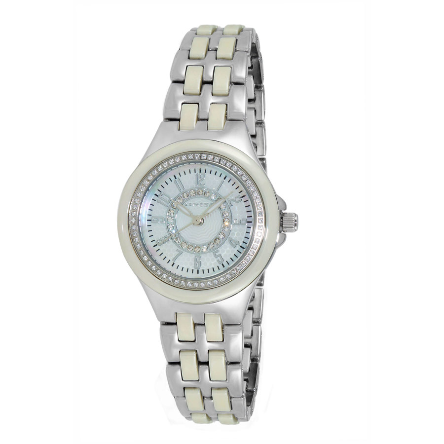 Silver-tone stainless steel case with a two-tone (silver-tone and beige) ceramic and stainless steel bracelet. Fixed two-tone (silver-tone and beige) crystal set, ceramic and stainless steel bezel. White dial with silver-tone hands and Arabic numeral hour markers. Minute markers around the outer rim. Dial Type: Analog. Luminescent hands. Quartz movement. Scratch resistant mineral crystal. Pull / push crown. Solid case back. Round case shape, case size: 29 mm, case thickness: 9 mm. Band width: 15 mm, band length: 6.25 inches. Deployment with push button release clasp. Water resistant at 50 meters / 165 feet. Functions: hour, minute, second. Dress watch style. Watch label: Japan Movt. Oniss ON2430 WhiteDial Ladies Watch ONJ2430-011IV.