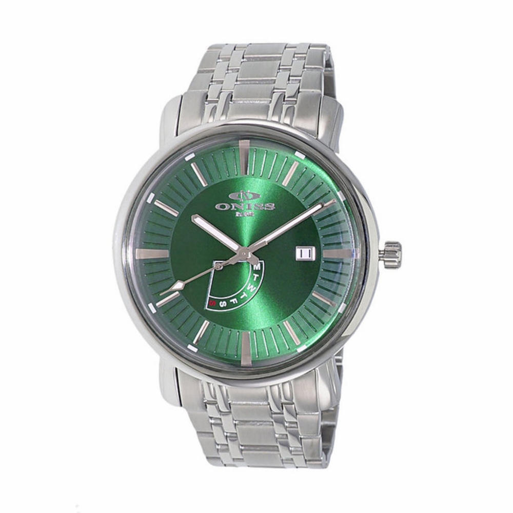 Silver-tone stainless steel case and bracelet. Fixed silver-tone stainless steel bezel. Green dial with silver-tone hands and index hour markers. Minute markers around the outer rim. Dial Type: Analog. Luminescent hands. Day / date. VX46E quartz movement. Scratch resistant acrylic crystal. Pull / push crown. Solid case back. Round case shape, case size: 44.0 mm, case thickness: 13.5 mm. Band width: 24.0 mm, band length: 7.0 inches. Fold over with double push button release clasp. Water resistant at 3 meters / 10 feet. Functions: date, day, hour, minute, second. Sorrento Series. Dress watch style. Watch label: Japan Movt. Oniss Sorrento Quartz Green Dial Mens Watch ON2626-MGN.