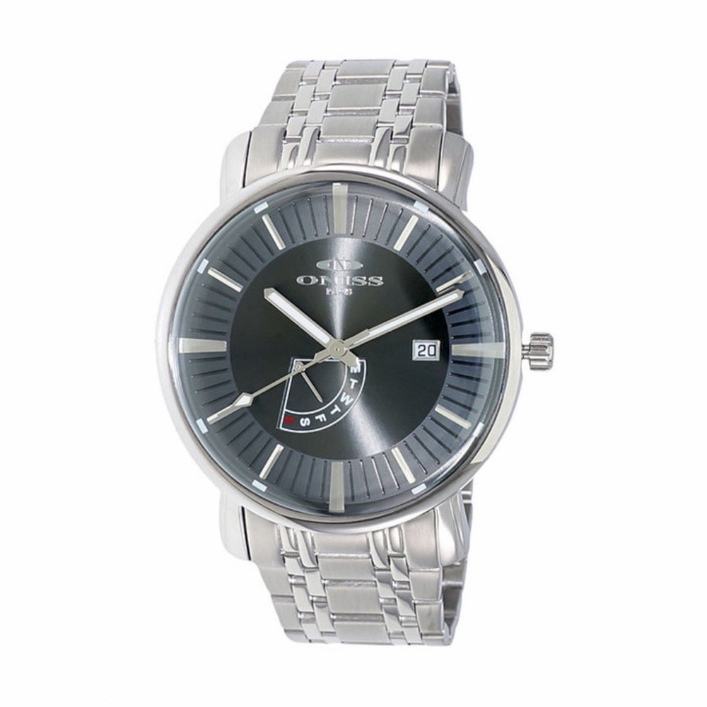 Silver-tone stainless steel case and bracelet. Fixed silver-tone stainless steel bezel. Grey dial with silver-tone hands and index hour markers. Minute markers around the outer rim. Dial Type: Analog. Luminescent hands. Day / date. VX46E quartz movement. Scratch resistant acrylic crystal. Pull / push crown. Solid case back. Round case shape, case size: 44.0 mm, case thickness: 13.5 mm. Band width: 24.0 mm, band length: 7.0 inches. Fold over with double push button release clasp. Water resistant at 3 meters / 10 feet. Functions: date, day, hour, minute, second. Sorrento Series. Dress watch style. Watch label: Japan Movt. Oniss Sorrento Quartz Grey Dial Mens Watch ON2626-MGY.