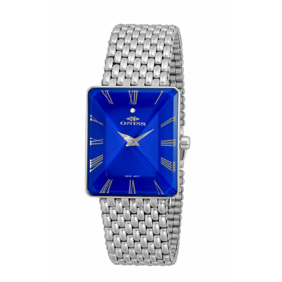 Silver-tone stainless steel case with a silver-tone stainless steel bracelet. Fixed silver-tone stainless steel bezel. Blue dial with silver-tone hands and Roman numeral hour markers. Dial Type: Analog. Quartz movement. Scratch resistant mineral crystal. Pull / push crown. Solid case back. Rectangle case shape, case size: 27 mm, case thickness: 10 mm. Band width: 20 mm, band length: 6.5 inches. Deployment with push button release clasp. Water resistant at 30 meters / 100 feet. Functions: hour, minute. Casual watch style. Watch label: Swiss Movt. Oniss ON4242 BlueDial Ladies Watch ONJ4242-012BU.