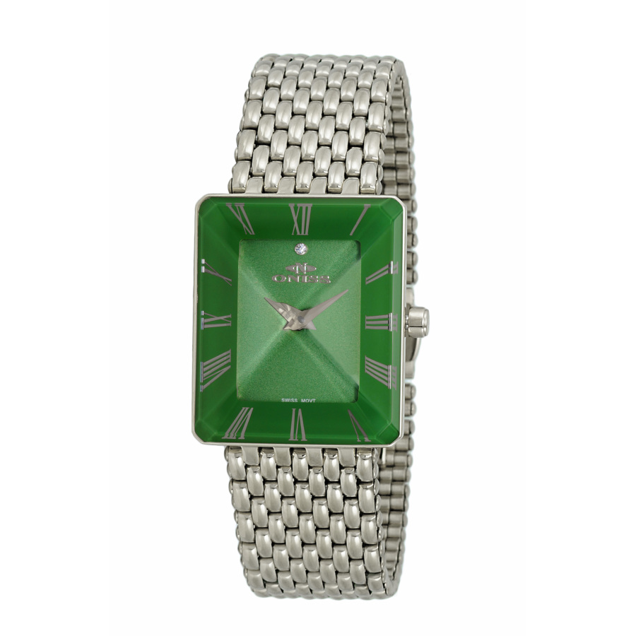 Silver-tone stainless steel case with a silver-tone stainless steel bracelet. Fixed silver-tone stainless steel bezel. Green dial with silver-tone hands and Roman numeral hour markers. Dial Type: Analog. Quartz movement. Scratch resistant mineral crystal. Pull / push crown. Solid case back. Rectangle case shape, case size: 27 mm, case thickness: 10 mm. Band width: 20 mm, band length: 6.5 inches. Deployment with push button release clasp. Water resistant at 30 meters / 100 feet. Functions: hour, minute. Casual watch style. Watch label: Swiss Movt. Oniss ON4242 GreenDial Ladies Watch ONJ4242-013GN.