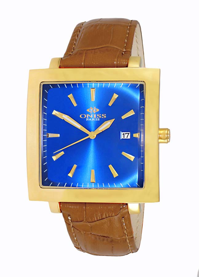 Gold-tone stainless steel case with a brown genuine leather strap. Fixed gold-tone stainless steel bezel. Blue dial with gold-tone hands and index hour markers. Minute markers around the outer rim. Dial Type: Analog. Luminescent hands. Date display at the 3 o'clock position. Quartz movement. Scratch resistant mineral crystal. Push pull crown. Solid case back. Square case shape, case size: 42 mm, case thickness: 13 mm. Band width: 22 mm, band length: 8.25 inches. Buckle clasp. Water resistant at 30 meters / 100 feet. Functions: date, hour, minute, second. Casual watch style. Watch label: Japan Movt. Oniss ON4444 Blue Dial Mens Watch ONJ4444-0GBU.
