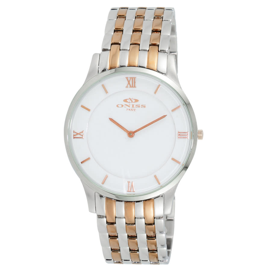 Silver-tone stainless steel case with a two-tone (silver-tone and rose gold-tone) stainless steel bracelet. Fixed silver-tone stainless steel bezel. White dial with rose gold-tone hands and Roman numeral & index hour markers. Dial Type: Analog. Ronda Caliber 762 quartz movement. Scratch resistant mineral crystal. Pull / push crown. Solid case back. Round case shape, case size: 39 mm, case thickness: 7 mm. Band width: 20 mm, band length: 6.375 inches. Fold over clasp. Water resistant at 30 meters / 100 feet. Functions: hour, minute. Casual watch style. Watch label: Swiss Made. Oniss ON5562SS Quartz White Dial Mens Watch ON5562SSTTWT.