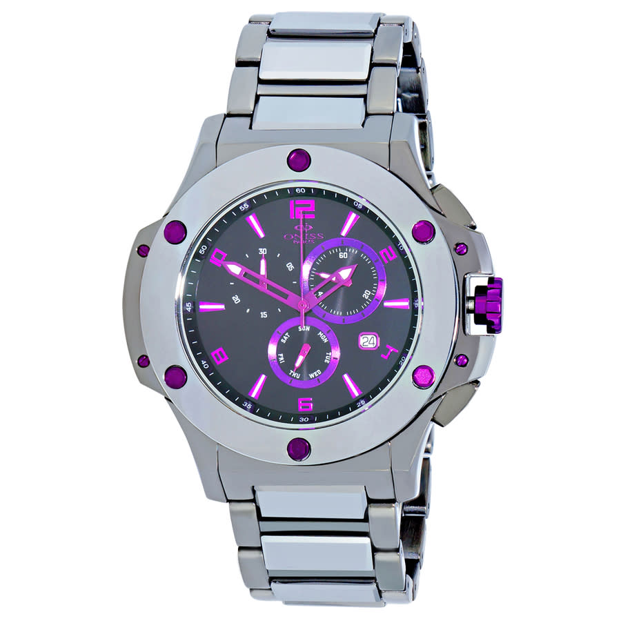 Gunmetal stainless steel case with a silver-tone stainless steel bracelet. Fixed silver-tone tungsten bezel. Multi-color dial with Arabic & index hour markers. Minute markers around the outer rim. Dial Type: Analog. Luminescent hands and markers. Date display at the 4 o'clock position. Three sub-dials displaying: 60 second, 30 minute and day. Quartz movement. Scratch resistant mineral crystal. Pull / push crown. Solid case back. Round case shape, case size: 52 mm, case thickness: 15 mm. Band width: 24 mm, band length: 7.75 inches. Deployment with push button release clasp. Water resistant at 50 meters / 165 feet. Functions: chronograph, date, day, hour, minute, second. Casual watch style. Oniss Chronograph Quartz Mens Watch ON612SSTPU.