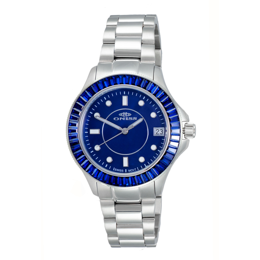 Silver-tone stainless steel case with a silver-tone stainless steel bracelet. Fixed blue crystal set bezel. Blue dial with silver-tone hands and index hour markers. Dial Type: Analog. Luminescent hands and markers. Date display at the 3 o'clock position. Quartz movement. Scratch resistant mineral crystal. Pull / push crown. Solid case back. Round case shape, case size: 36 mm, case thickness: 11 mm. Band width: 18 mm, band length: 6.5 inches. Fold over with safety release clasp. Water resistant at 30 meters / 100 feet. Functions: date, hour, minute, second. Dress watch style. Watch label: Swiss Movt. Oniss ON7323 BlueDial Ladies Watch ONJ7323-010DKBU.