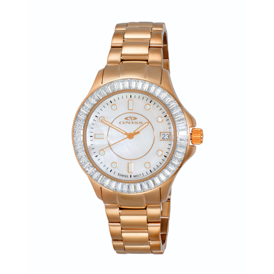 Rose gold-tone stainless steel case with a rose gold-tone stainless steel bracelet. Fixed white crystal set bezel. White dial with gold-tone hands and index hour markers. Minute markers around the outer rim. Dial Type: Analog. Luminescent hands and markers. Date display at the 3 o'clock position. Quartz movement. Scratch resistant mineral crystal. Pull / push crown. Solid case back. Round case shape, case size: 36 mm, case thickness: 11 mm. Band width: 18 mm, band length: 6.5 inches. Fold over with safety release clasp. Water resistant at 30 meters / 100 feet. Functions: date, hour, minute, second. Dress watch style. Watch label: Swiss Movt. Oniss ON7324 WhiteDial Ladies Watch ONJ7324-020RGWT-WTC.