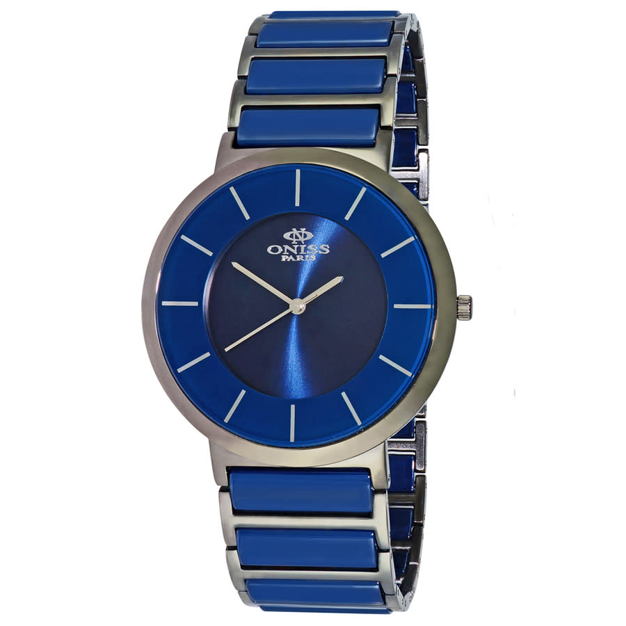 Gunmetal stainless steel case with a blue stainless steel bracelet. Fixed blue glass bezel. Blue dial with silver-tone hands and index hour markers. Dial Type: Analog. Quartz movement. Scratch resistant mineral crystal. Pull / push crown. Solid case back. Round case shape, case size: 44 mm, case thickness: 7 mm. Band width: 24 mm, band length: 7.5 inches. Deployment with push button release clasp. Water resistant at 30 meters / 100 feet. Functions: hour, minute, second. Casual watch style. Watch label: Swiss Made. Oniss ON5555 SS-Ceramic series Quartz Blue Dial Mens Watch ON5555.