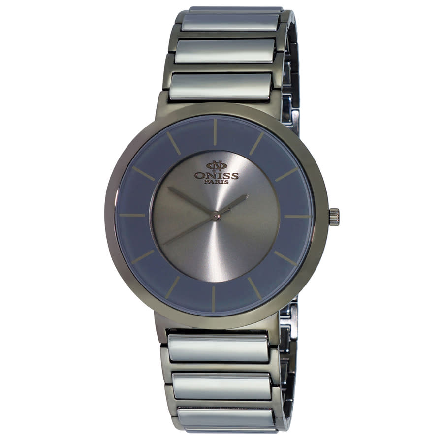 Gunmetal stainless steel case with a multi-color tungsten band. Fixed grey glass bezel. Grey dial with index hour markers. Dial Type: Analog. Quartz movement. Scratch resistant mineral crystal. Pull / push crown. Solid case back. Round case shape, case size: 44 mm, case thickness: 7 mm. Band width: 24 mm, band length: 7.5 inches. Deployment with push button release clasp. Water resistant at 30 meters / 100 feet. Functions: hour, minute, second. Casual watch style. Watch label: Swiss Made. Oniss ON5555 SS-Tungsten Series Quartz Grey Dial Mens Watch ON5555SST.