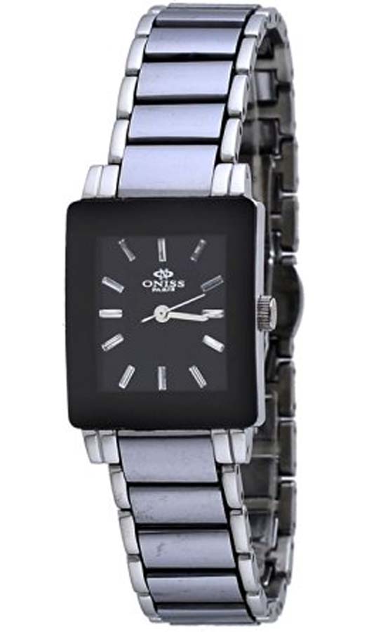 Silver-tone stainless steel case with a two-tone (silver-tone and blue) stainless steel and tungsten bracelet. Fixed black bezel. Black dial with silver-tone hands and baguette crystals hour markers. Dial Type: Analog. Quartz movement. Scratch resistant mineral crystal. Solid case back. Rectangle case shape, case size: 34.2 mm x 22.25 mm, case thickness: 7.38 mm. Deployment clasp. Water resistant at 30 meters / 100 feet. Functions: hour, minute, second. Dress watch style. Oniss Black Dial Stainless Steel Ladies Watch ON607-LPV.