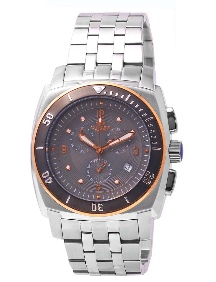 Stainless steel case with a stainless steel bracelet. Grey dial with rose gold-tone hands and index hour markers. Minute markers around the outer rim. Dial Type: Analog. Date display at the 4 o'clock position. Chronograph - three sub-dials displaying: 60 second, 30 minute and date. Quartz movement. Scratch resistant mineral crystal. Case size: 45 mm. Round case shape. Deployment clasp. Water resistant at 100 meters / 330 feet. Functions: chronograph, date, hour, minute, second. Dress watch style. Oniss Grey Dial Multi-function Stainless Steel Mens Watch ON614-M.
