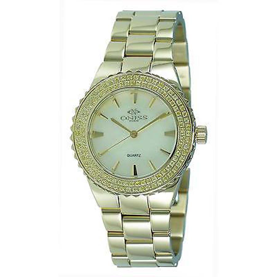 Gold-tone stainless steel case with a gold-tone stainless steel bracelet. Fixed with yellow austrian crystal around bezel. Yellow dial with gold-tone hands and index hour markers. Dial Type: Analog. Quartz movement. Scratch resistant mineral crystal. Solid case back. Case size: 34 mm. Round case shape. Deployment with push button release clasp. Water resistant at 50 meters / 165 feet. Functions: hour, minute, second. Dress watch style. Watch label: Swiss Made. Oniss Magnifico Yellow Dial Gold Tone Stainless Steel Ladies Watch ON8181-LG/Y/Y-C.
