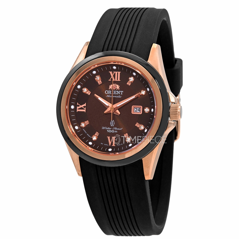 Rose gold-tone stainless steel case with a black rubber strap. Fixed rose gold-tone bezel with a black ring. Brown dial with luminous rose gold-tone hands and crystal-tipped index hour markers. Roman numeral markers at the 6,9 and 12 o'clock positions. Minute markers around the outer rim. Dial Type: Analog. Luminescent hands and markers. Date display at the 3 o'clock position. Orient caliber 40N41 automatic movement with a 40-hour power reserve. Scratch resistant sapphire crystal. Pull / push crown. Solid case back. Round case shape. Case size: 32 mm. Case thickness: 11.25 mm. Tang clasp. Water resistant at 100 meters / 330 feet. Functions: date, hour, minute, second. Casual watch style. Watch label: Japan Movt. Orient Automatic Crystal Brown Dial Ladies Watch FNR1V001T0.