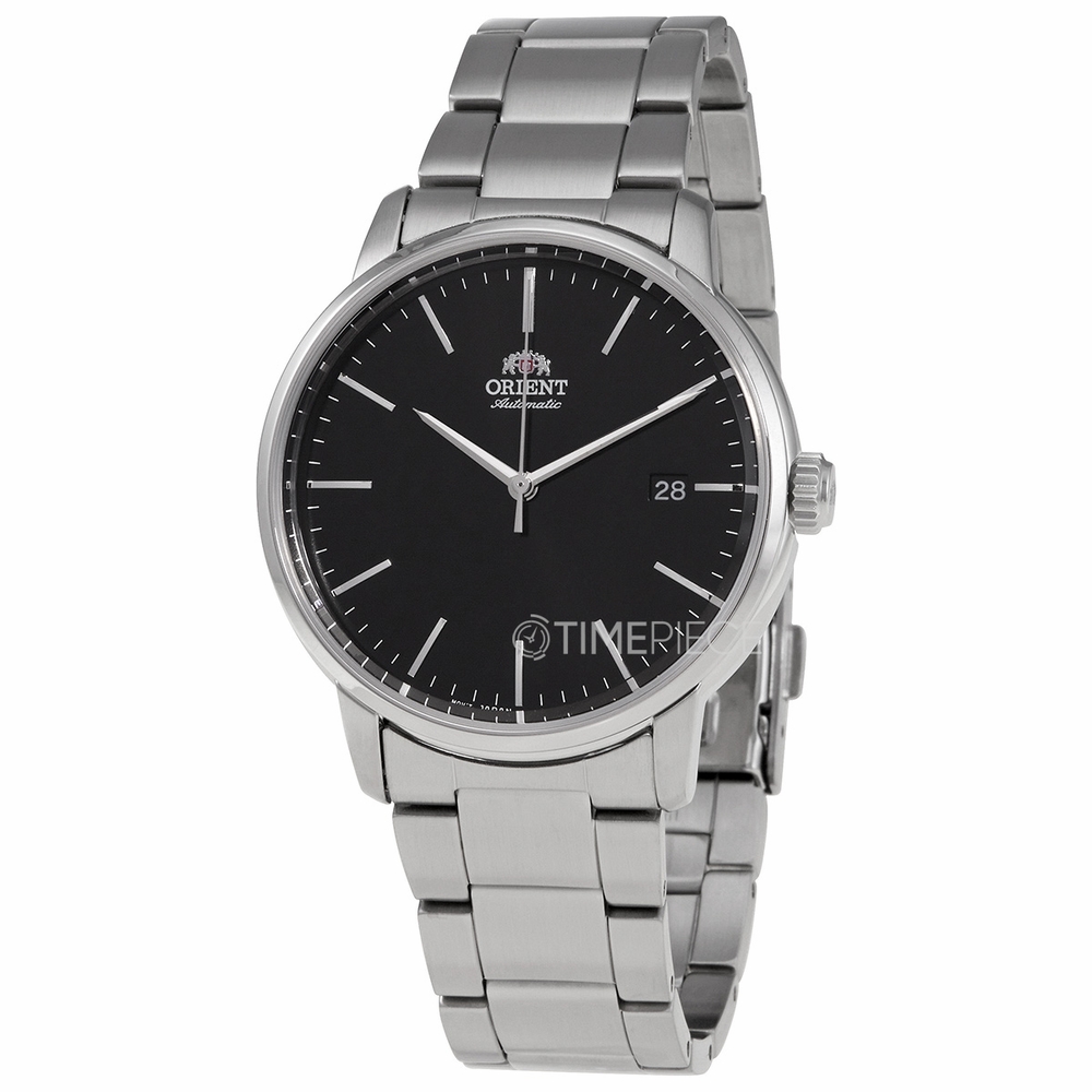 Stainless steel case with a stainless steel bracelet. Fixed stainless steel bezel. Black dial with silver-tone hands and index hour markers. Minute markers around the outer rim. Dial Type: Analog. Date display at the 3 o'clock position. Orient calibre F6S22 automatic movement with a 40-hour power reserve. Scratch resistant mineral crystal. Pull / push crown. Transparent case back. Round case shape. Case size: 40 mm. Case thickness: 12 mm. Band width: 20 mm. Fold over clasp with a push button release. Water resistant at 100 meters / 330 feet. Functions: date, hour, minute, second. Classic Series. Casual watch style. Watch label: Japan Movt. Orient Classic Automatic Black Dial Mens Watch RA-AC0E01B10B.