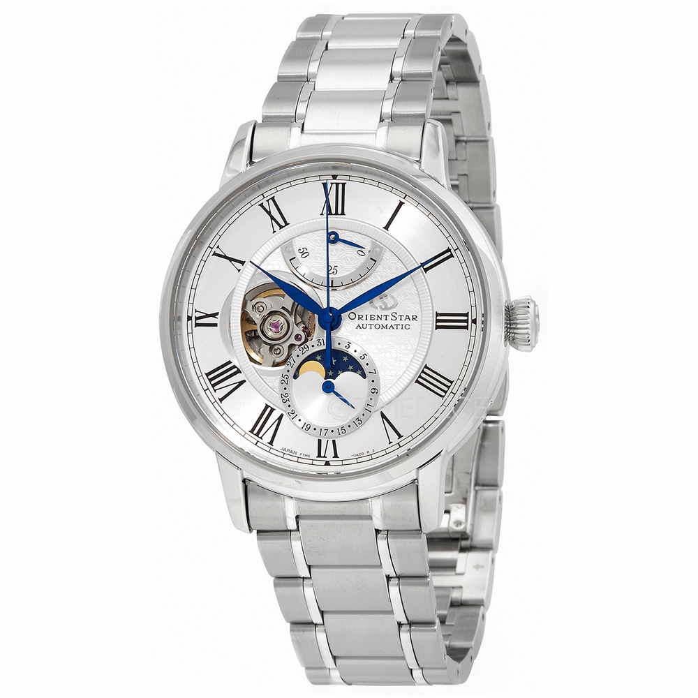 Silver-tone stainless steel case and bracelet. Fixed silver-tone stainless steel bezel. White dial with blue hands and Roman numeral hour markers. Minute markers around the outer rim. Dial Type: Analog. Two sub-dials displaying: date/moonphase and power reserve indicator. Orient Calibre F7M62 automatic movement with a 50-hour power reserve. Scratch resistant sapphire crystal. Pull / push crown. Transparent see through case back. Round case shape, case size: 41 mm, case thickness: 12 mm. Folding clasp. Water resistant at 50 meters / 165 feet. Functions: date, hour, minute, second, power reserve indicator, moonphase. Classic Series. Dress watch style. Watch label: Japan Movt. Orient Classic Automatic White Dial Mens Watch RE-AY0102S00B.