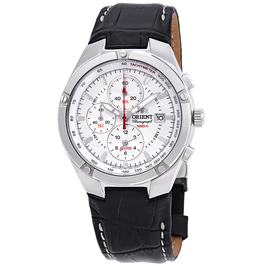 Silver-tone stainless steel case with a black leather strap. Fixed silver-tone stainless steel bezel. Silver-tone dial with silver-tone hands and index hour markers. Tachymeter scale around the outer rim. Dial Type: Analog. Luminescent hands. Date display at the 3 o'clock position. Chronograph - three sub-dials displaying: 60 second, 60 minute and 12 hour/60 minute. Orient Calibre KFA00 quartz movement. Screw down crown. Solid case back. Round case shape, case size: 42 mm, case thickness: 10 mm. Buckle clasp. Water resistant at 100 meters / 330 feet. Functions: alarm, chronograph, second time zone, date, hour, minute, second. Sport watch style. Watch label: Japan Movt. Orient Classic Alarm Chronograph Silver Dial Mens Watch FTD0P004W.