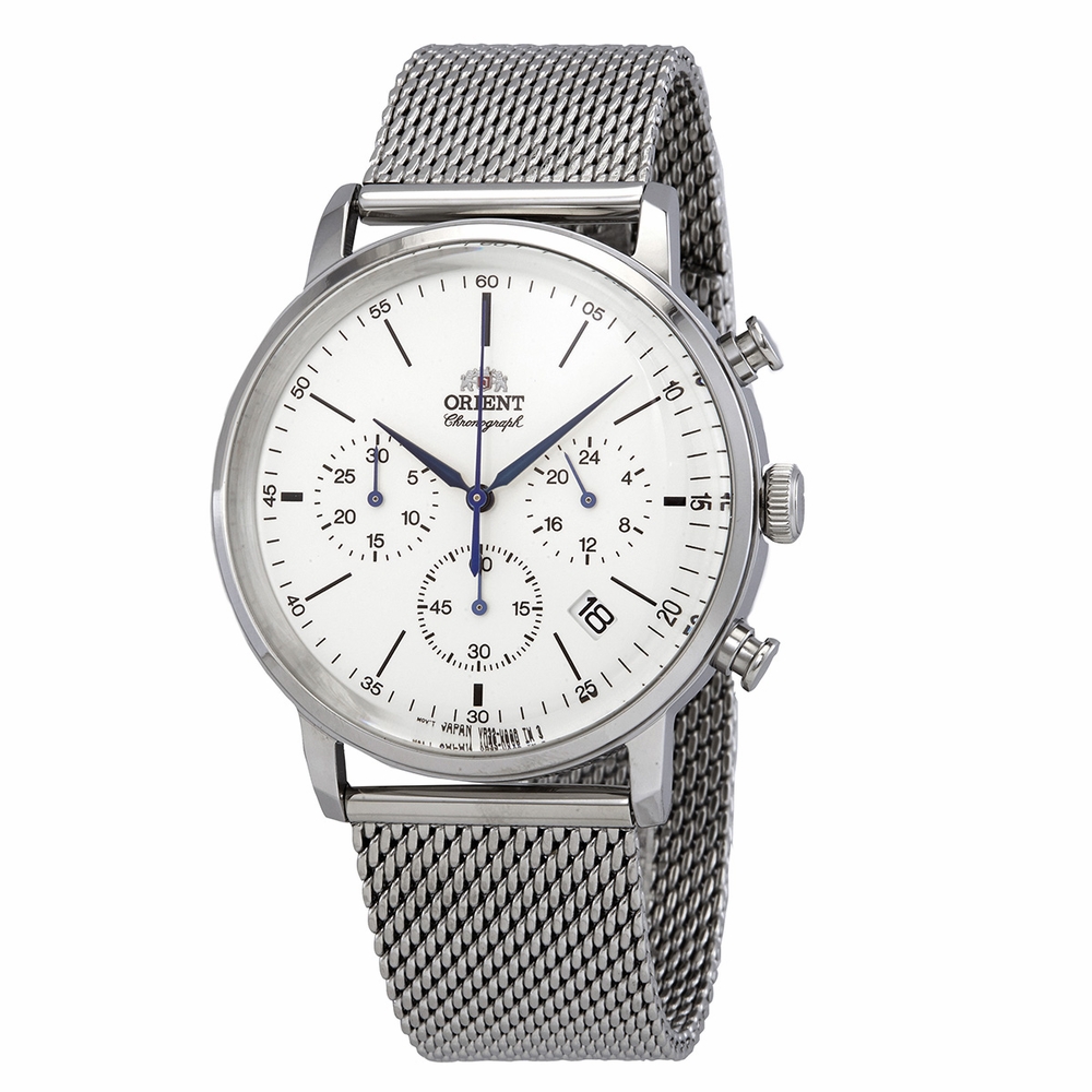 Stainless steel case with a stainless steel mesh bracelet. Fixed stainless steel bezel. White dial with blue hands and index hour markers. Minute markers around the outer rim. Dial Type: Analog. Date display between the 4 and 5 o'clock positions. Chronograph - three sub-dials displaying: 60 second, 30 minute and 12 hour. Quartz movement. Scratch resistant Hardlex crystal. Pull / push crown. Solid case back. Round case shape. Case size: 42.4 mm. Case thickness: 12 mm. Band width: 20 mm. Fold over clasp. Water resistant at 50 meters / 165 feet. Functions: date, hour, minute, second. Casual watch style. Watch label: Japan Movt. Orient Classic White Dial Mens Watch RA-KV0402S10B.