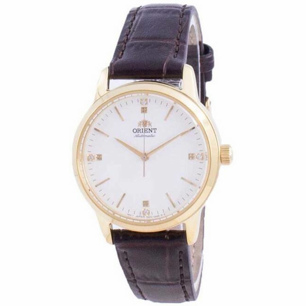 Gold-tone stainless steel case with a brown leather strap. Fixed gold-tone bezel. White dial with gold-tone hands and index hour markers. Crystal index markers atthe 3, 6, 9 and 12 o'clock positions. Minute markers around the outer rim. Dial Type: Analog. Caliber: 55542 automatic movement. Scratch resistant mineral crystal. Pull / push crown. Transparent case back. Round case shape. Case size: 32 mm. Case thickness: 12 mm. Band width: 14 mm. Tang clasp. Water resistant at 100 meters / 330 feet. Functions: hour, minute, second. Contemporary Series. Dress watch style. Watch label: Japan Movt. Orient Contemporary Automatic Crystal White Dial Ladies Watch RA-NB0104S10B.