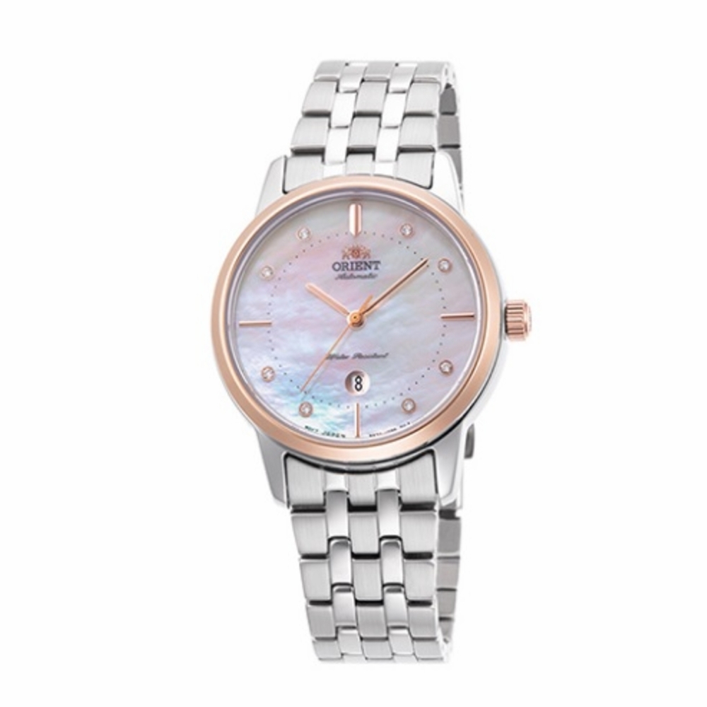 Silver-tone stainless steel case and bracelet. Fixed rose gold-tone stainless steel bezel. Mother of pearl dial with rose gold-tone hands and diamond-index hour markers. Index marker appears at the 3, 6, 9 and 12 o'clock positions. Minute markers around the inner ring. Dial Type: Analog. Date display above the 6 o'clock position. Orient Calibre 55744 automatic movement. Scratch resistant sapphire crystal. Pull / push crown. Transparent case back. Round case shape, case size: 32 mm. Fold over clasp with a safety release. Water resistant at 50 meters / 165 feet. Functions: date, hour, minute, second. Contemporary Series. Dress watch style. Watch label: Japan Movt. Orient Contemporary Automatic Diamond Mother of Pearl Dial Ladies Watch RA-NR2006A10B.