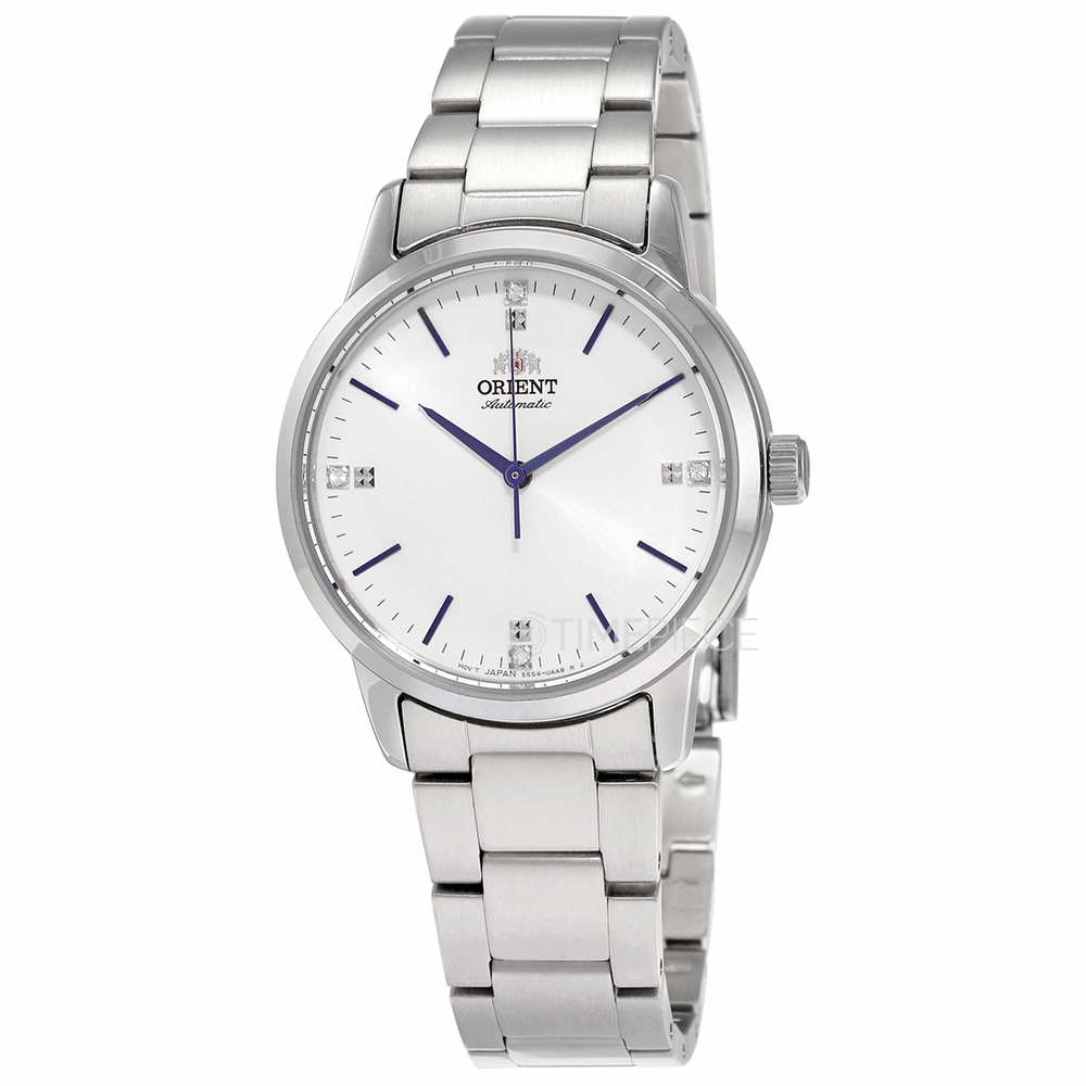 Silver-tone stainless steel case and bracelet. Fixed silver-tone stainless steel bezel. White dial with blue hands and index hour markers. Dial Type: Analog. 55542 automatic movement. Scratch resistant mineral crystal. Pull / push crown. Transparent see through case back. Round case shape, case size: 32 mm. Deployment with push button release clasp. Water resistant at 100 meters / 330 feet. Functions: day, hour, minute, second. Contemporary Series. Casual watch style. Watch label: Japan Movt. Orient Contemporary Automatic White Dial Ladies Watch RA-NB0102S10B.
