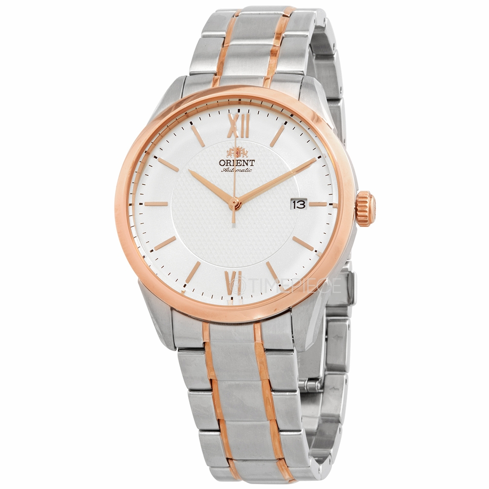 Silver-tone stainless steel case with a two-tone (silver-tone and rose gold-tone) stainless steel bracelet. Fixed rose gold-tone stainless steel bezel. White dial with gold-tone hands and Roman numeral hour markers. Minute markers around the outer rim. Dial Type: Analog. Date display at the 3 o'clock position. Orient Calibre F6722 Automatic movement, containing 22 Jewels, bitting at 21600 vph, and has a power reserve of approximately 40 hours. Scratch resistant sapphire crystal. Pull / push crown. Transparent case back. Round case shape, case size: 40.8 mm, case thickness: 12 mm. Deployment with push button release clasp. Water resistant at 100 meters / 330 feet. Functions: date, hour, minute, second. Contemporary Series. Dress watch style. Watch label: Japan Movt. Orient Contemporary Automatic White Dial Mens Watch RA-AC0012S10D.