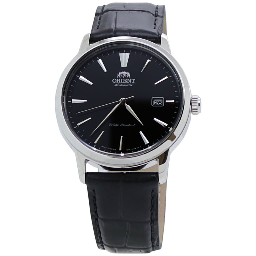 Silver-tone stainless steel case with a black leather strap. Fixed silver-tone stainless steel bezel. Black dial with silver-tone hands and index hour markers. Minute markers around the outer rim. Dial Type: Analog. Date display at the 3 o'clock position. Automatic movement. Scratch resistant Hardlex crystal. Pull / push crown. Solid case back. Round case shape, case size: 42 mm, case thickness: 12 mm. Band width: 22 mm. Tang clasp. Water resistant at 50 meters / 165 feet. Functions: date, hour, minute, second. Contemporary Series. Casual watch style. Orient Contemporary Automatic Black Dial Mens Watch RA-AC0F05B10B.