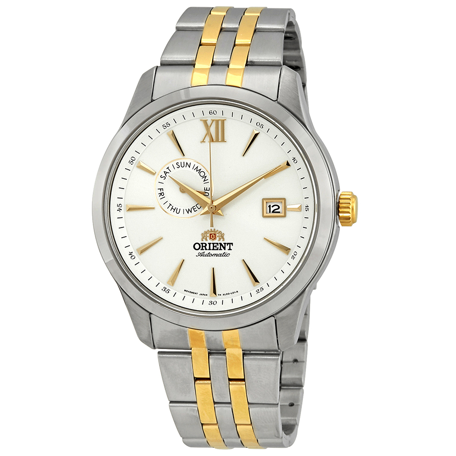 Silver-tone stainless steel case with a two-tone (silver-tone and yellow gold PVD) stainless steel bracelet. Fixed silver-tone stainless steel bezel. White dial with yellow gold-tone hands and index hour markers. Roman numeral appears at the 12 o'clock position. minute markers around the outer rim. Dial Type: Analog. Date display at the 3 o'clock position. Day of the week subdials. Automatic movement. Scratch resistant mineral crystal. Transparent case back. Round case shape, case size: 42 mm, case thickness: 12 mm. Band width: 22 mm. Deployment with push button release clasp. Water resistant at 50 meters / 165 feet. Functions: date, day, hour, minute, second. Casual watch style. Watch label: Japan Movt. Orient Contemporary White Dial Mens Watch FAL00001W0.