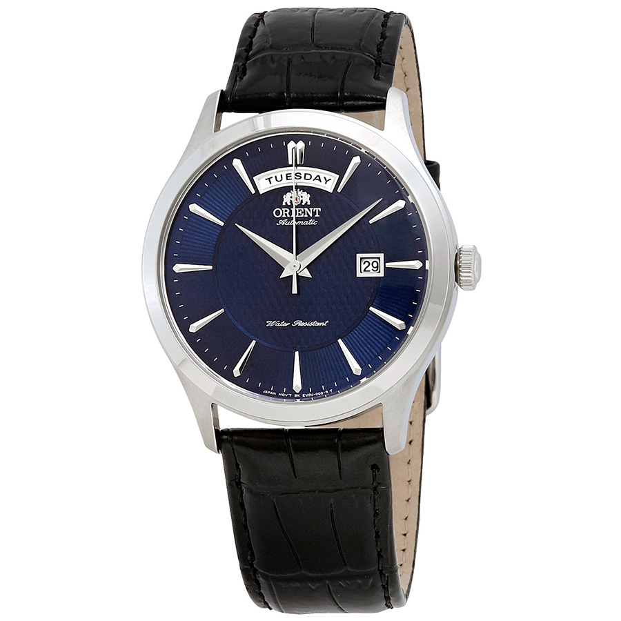 Silver-tone stainless steel case with a black leather strap. Fixed silver-tone stainless steel bezel. Blue dial with silver-tone hands and index hour markers. Dial Type: Analog. Luminescent hands. Date display at the 3 o'clock position. Automatic movement with a 40-hour power reserve. Scratch resistant mineral crystal. Pull / push crown. Solid case back. Round case shape, case size: 41 mm, case thickness: 12 mm. Buckle clasp. Water resistant at 50 meters / 165 feet. Functions: date, hour, minute, second. Casual watch style. Watch label: Japan Movt. Orient Contemporary Automatic Blue Dial Mens Watch FEV0V003DH.
