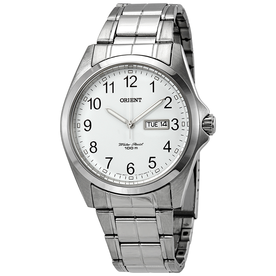 Stainless steel case with a stainless steel bracelet. Fixed stainless steel bezel. White dial with luminous silver-tone hands and Arabic numeral hour markers. Minute markers around the outer rim. Dial Type: Analog. Luminescent hands and markers. Day of the week and date display at the 3 o'clock position. Quartz movement. Scratch resistant mineral crystal. Solid case back. Round case shape. Case size: 40 mm. Case thickness: 9 mm. Band width: 19 mm. Fold over clasp. Water resistant at 100 meters / 330 feet. Functions: date, day, hour, minute, second. Casual watch style. Watch label: Japan Movt. Orient Contemporary White Dial Mens Watch FUG1H002W6.