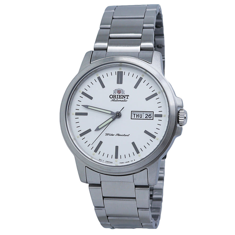 Stainless steel case with a stainless steel bracelet. Fixed stainless steel bezel. White dial with luminous silver-tone pencil-style hands and index hour markers. Minute markers around the outer rim. Dial Type: Analog. Luminescent hands and markers. Day of the week and date display at the 3 o'clock position. Orient calibre F6922 automatic movement, containing 22 Jewels, bitting at 21600 vph, and has a power reserve of approximately 40 hours. Scratch resistant mineral crystal. Pull / push crown. Transparent case back. Round case shape. Case size: 42 mm. Case thickness: 12 mm. Band width: 21 mm. Deployment clasp with a push button release. Water resistant at 50 meters / 165 feet. Functions: date, day, hour, minute, second. Contemporary Series. Casual watch style. Watch label: Japan Movt. Orient Contemporary Automatic White Dial Mens Watch RA-AA0C03S19B.