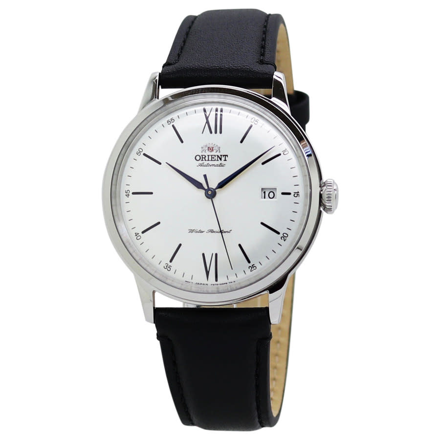 Stainless steel case with a black leather strap. Fixed stainless steel bezel. White dial with black hands and index hour markers. Roman numerals appear at the 6 and 12 o'clock positions. Arabic numeral minute markers (at 5 minute intervals). Minute markers around the outer rim. Dial Type: Analog. Date display at the 3 o'clock position. Automatic movement. Scratch resistant mineral crystal. Pull / push crown. Transparent case back. Round case shape. Case size: 40.5 mm. Case thickness: 12.3 mm. Band width: 21 mm. Tang clasp. Water resistant at 30 meters / 100 feet. Functions: date, hour, minute, second. Contemporary Series. Casual watch style. Watch label: Japan Movt. Orient Contemporary Automatic White Dial Mens Watch RA-AC0022S10B.