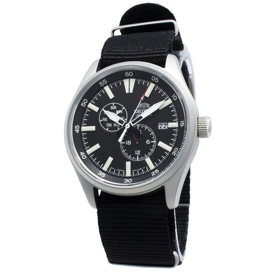 Stainless steel case with a black nylon strap. Fixed stainless steel bezel. Black dial with luminous silver-tone hands and index hour markers. Minute markers around the outer rim. Dial Type: Analog. Luminescent hands and markers. Date display at the 3 o'clock position. Two sub-dials displaying: 24 hour and day of the week. Caliber F6B22 automatic movement. Scratch resistant mineral crystal. Screw down crown. Solid case back. Round case shape. Case size: 42 mm. Case thickness: 12 mm. Tang clasp. Water resistant at 100 meters / 330 feet. Functions: date, hour, minute, second. Sport watch style. Watch label: Japan Movt. Orient Defender Automatic Black Dial Mens Watch RA-AK0404B10B.