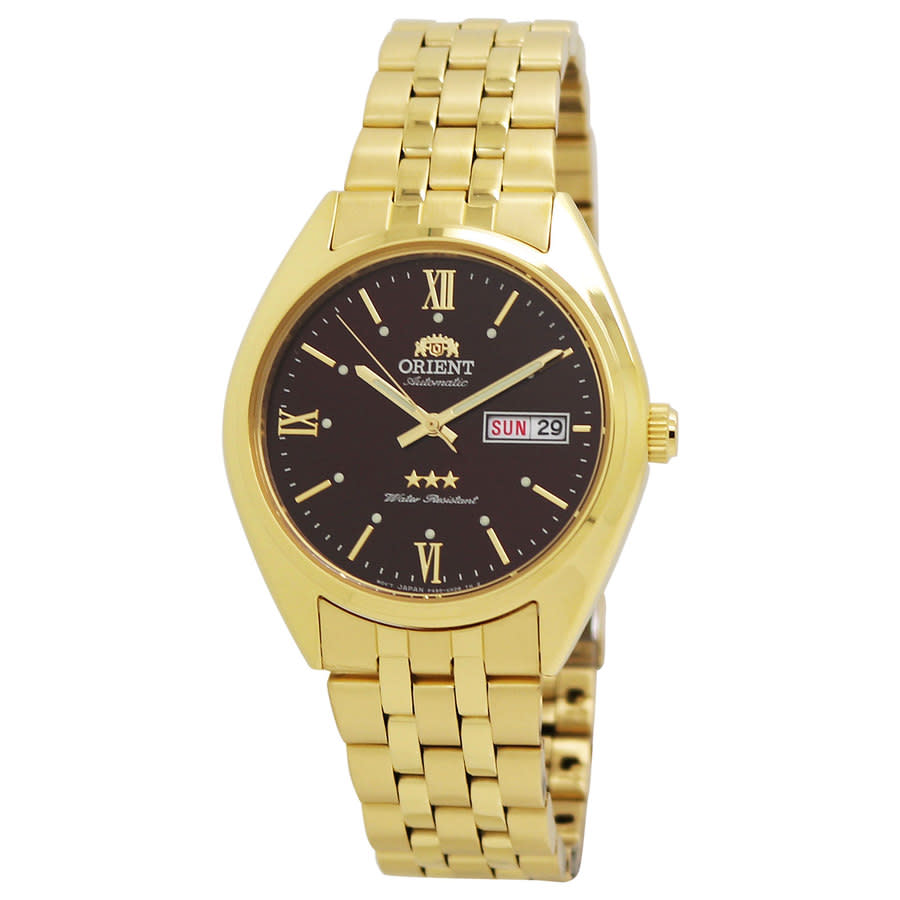 Yellow gold-tone stainless steel case and bracelet. Fixed yellow gold-tone bezel. Brown dial with luminous yellow gold-tone hands and index hour markers. Roman numerals appear at the 6, 9 and 12 o'clock positions. Minute markers around the outer rim. Dial Type: Analog. Luminescent hands and markers. Day of the week and date display at the 3 o'clock position. Automatic movement. Scratch resistant mineral crystal. Pull / push crown. Solid case back. Round case shape. Case size: 39 mm. Case thickness: 11.2 mm. Band width: 20 mm. Fold over clasp. Water resistant at 30 meters / 100 feet. Functions: date, day, hour, minute, second. Deneb Tri Star Series. Casual watch style. Watch label: Japan Movt. Orient Deneb Tri Star Brown Dial Mens Watch RA-AB0E12R19B.