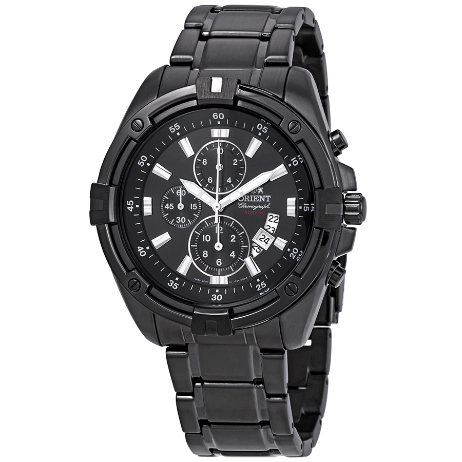 Black stainless steel case with a black stainless steel bracelet. Fixed black stainless steel bezel. Black dial with index hour markers. Minute markers around the outer rim. Dial Type: Analog. Luminescent hands and markers. Date display between 4 and 5 o'clock position. Chronograph - three sub-dials displaying: 60 second, 12 hour/60 minute and 1/10th of a second. Orient Calibre KFB00 quartz movement. Scratch resistant mineral crystal. Screw down crown. Solid case back. Round case shape, case size: 48 mm, case thickness: 11.6 mm. Band width: 24 mm. Fold over clasp. Water resistant at 100 meters / 330 feet. Functions: chronograph, date, second time zone, hour, minute, second. Sport watch style. Watch label: Japan Movt. Orient Endeavor Chronograph Black Dial Mens Watch FTT0Y001B0.